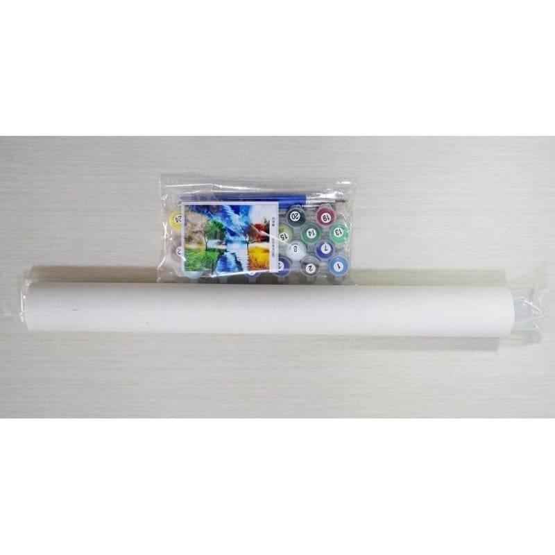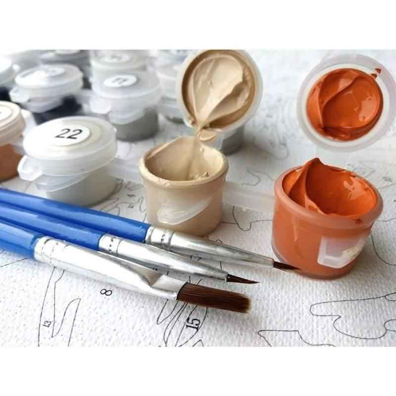 A typical paint by numbers kit includes a pre-printed canvas marked with numbers, small pots of paint in the required colors, and one or more paintbrushes. You might also want a cup of water for rinsing brushes and a cloth for wiping.