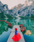 The "The Fanes Sennes Prags Nature Park Italy" painting, part of our amazing travel collection, features the heavenly snow-capped mountains of Prags Nature Park in Italy and clear waters beneath them. Enhancing the bewitching beauty of this painting is a girl dressed in a graceful red dress and a few wooden boats by the waters. This painting has an extremely delicate balance of colors as the waters reflect the image of the mountains above it.